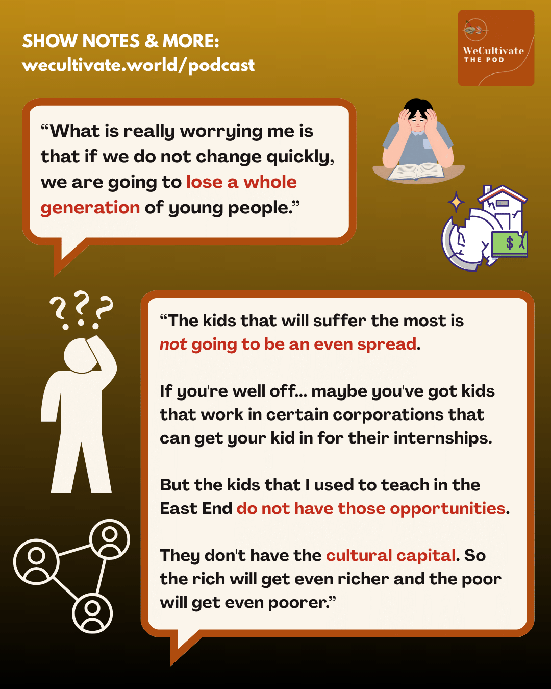 So that's another passion of mine as well. And the thing is, the kids that will suffer the most is not going to be an even spread. If you are well off, if you are upper class or middle class, maybe you've got kids that work in certain corporations that can get your kid in for their internships or they can squeeze in. But the kids that I used to teach in the East end do not have those opportunities. They don't have the cultural capital. So they're the ones that are going to get, so what's going to happen is the rich will get even richer and the poor will get even poorer. And that's a crime as far as I'm concerned.