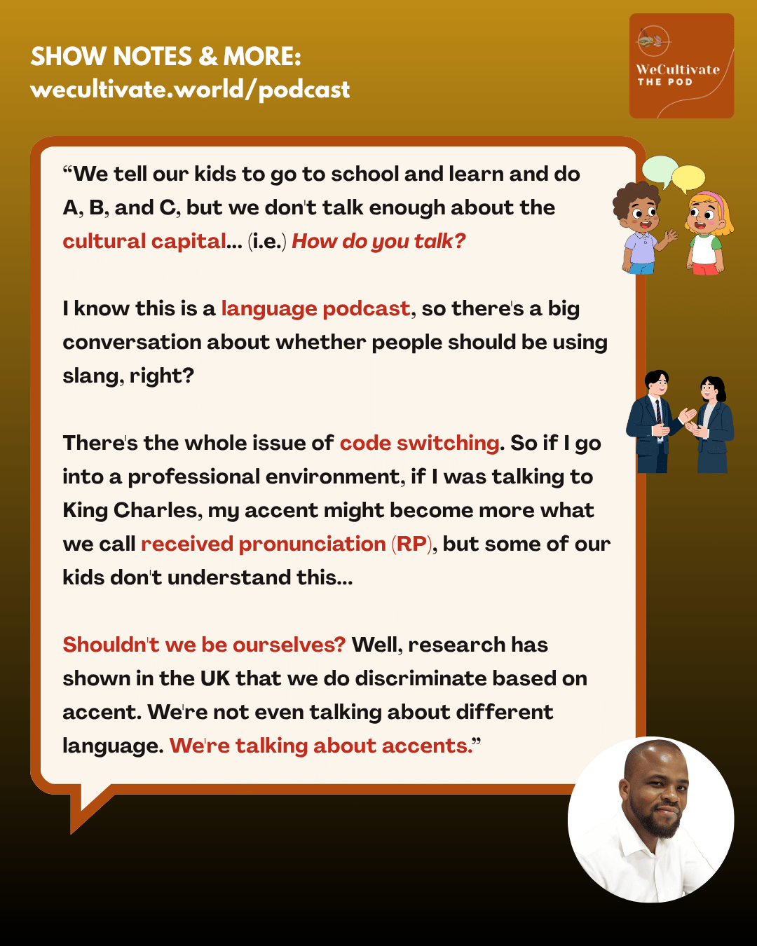 Because these are all markers of where you, right? So we tell our kids to go to school and learn and do A, B, and C, but we don't talk enough about the cultural capital. How do you talk? There's a big, I know this is a language podcast, so there's a big conversation about how whether people should be using slang, right? So I talk in a London accent. I talk in quite a London accent, but there's the whole issue of code switching. So if I go into a professional environment, if I was talking to King Charles, my accent might become more what we call received pronunciation. But some of our kids don't understand this. And rightly or wrongly, should we be code switching? Shouldn't we be ourselves? Well, research has shown in the UK that we do discriminate based on accent. We're not even talking about different language, we're talking about accent.